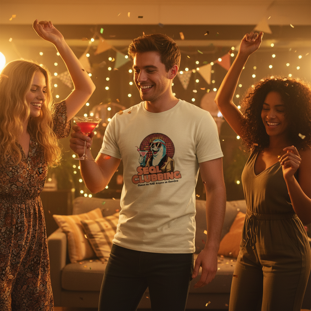 This one’s for the party animals of the Arctic circle. Featuring a suave seal with shades and a cocktail, this tee isn’t about that kind of clubbing – we’re talking disco balls, bad decisions, and slippery dance moves. 🪩❄️